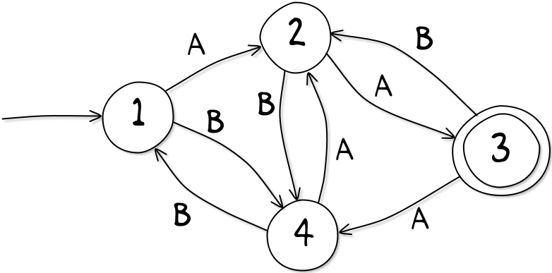For example this automata, you start on the node 1 and travel through the automata depending on the word you are inputting. For example the word BBABA ends at the node 2. Because